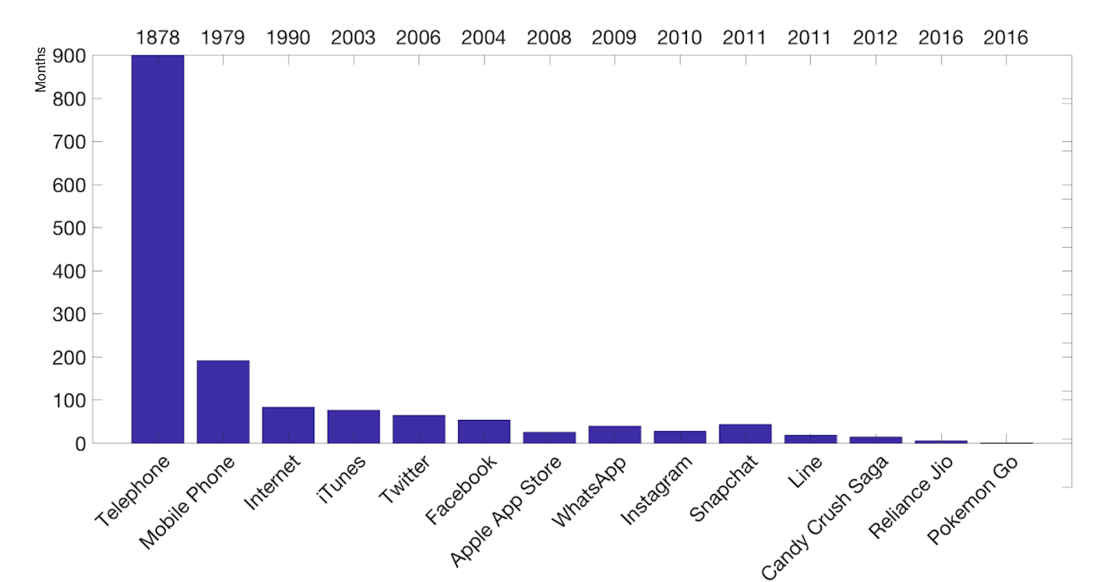 Starting a tech company, building a good product, and gaining traction have become easier thanks to improved connectivity, declining cloud storage and computing costs, and the accessibility of distribution platforms for reaching target audiences. As a result, the time it takes a product to reach 100 million monthly active users has shortened dramatically, and continues to shrink today. For example, it took about 100 months for iTunes to reach 100 million monthly active users in 2003 and mere days for Pokemon Go to do the same. The chart below has some more good examples, starting with the telephone.